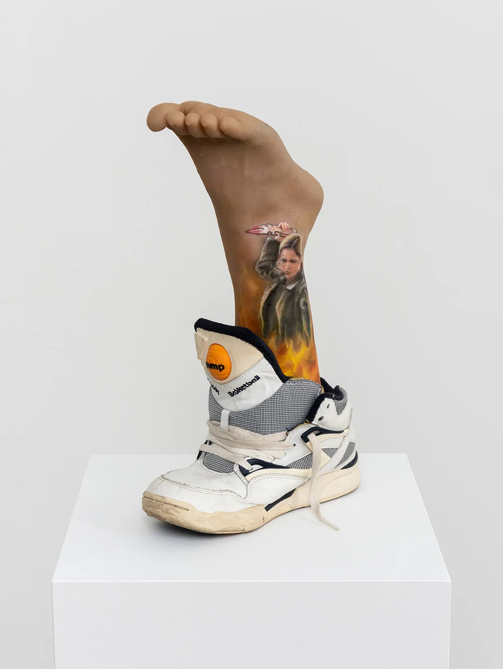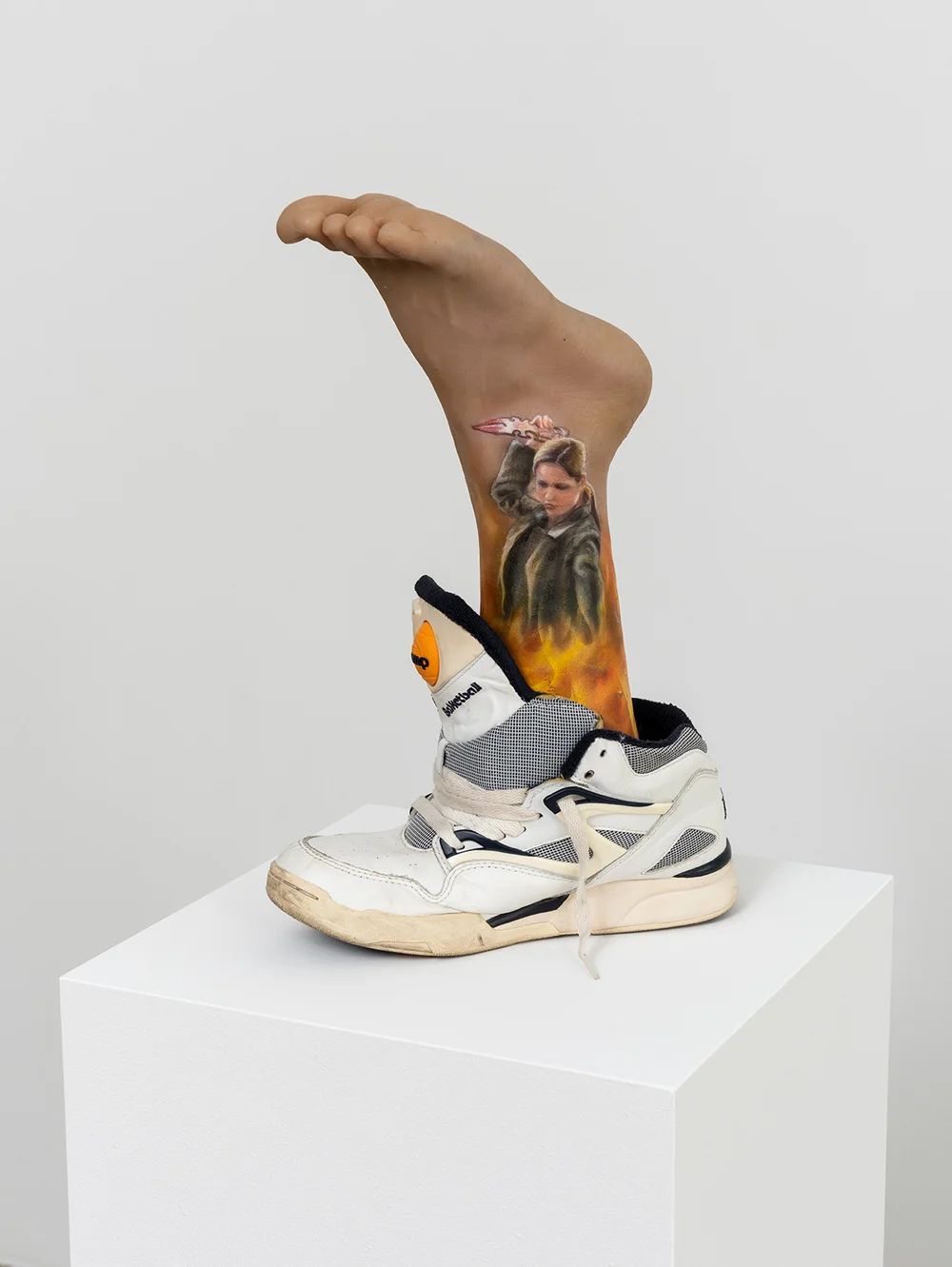 As in much of Di Giovanni’s work, the domestic or popular object (here, the sneaker) is repurposed to activate a shared visual memory, while the fake, fragmented body speaks as much to fetishism as to survival. The reversal of the foot plays with the logic of the simulacrum: it is not a foot, but the image of a possible body — a fictionalized body — whose skin becomes a narrative surface. At the intersection of prop, relic, and toy, this sculpture brings together the intimate and the collective, the kitsch and the sacred.