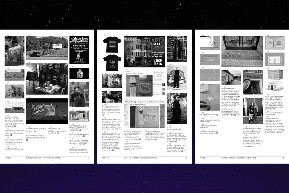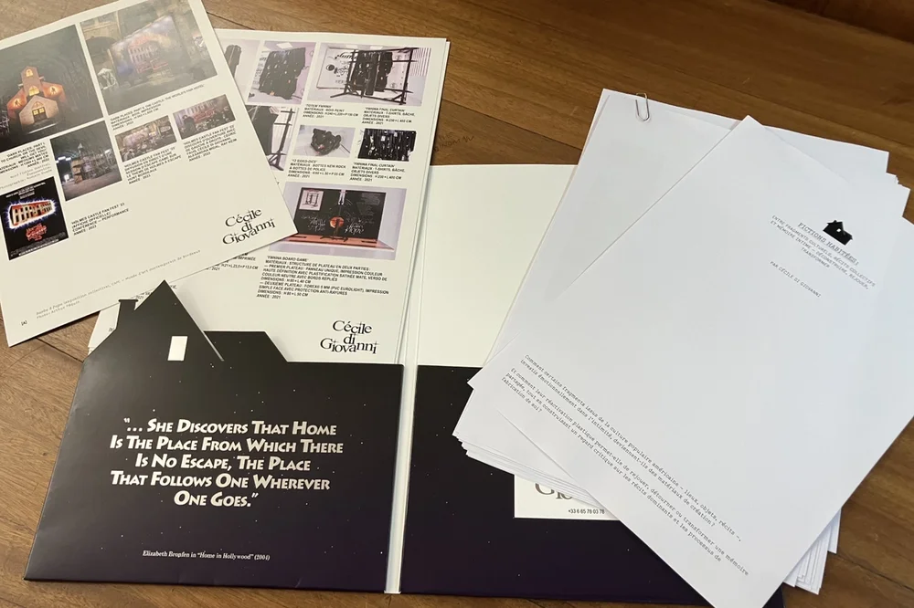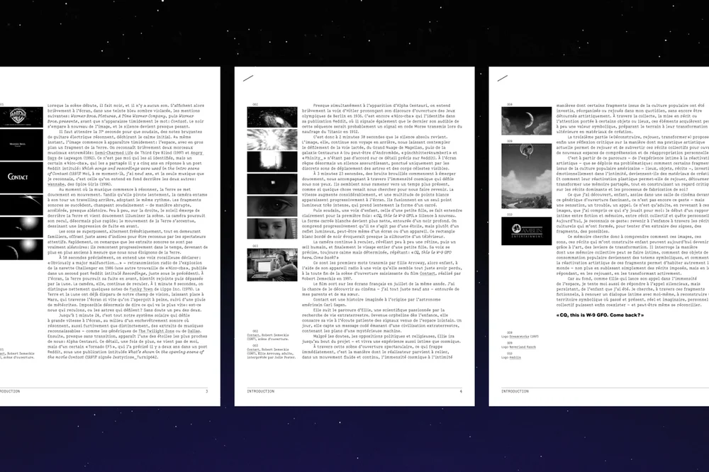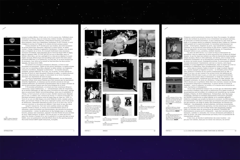 The thesis takes shape not only as a body of research but also as a printed object, a hybrid of an artist’s book and a critical journal. Conceived as an extension of Cécile’s visual and narrative vocabulary, it weaves together texts, images, and archival fragments into a sequence that mirrors the layered nature of her thinking. Drawing on late 1990s and early 2000s U.S. press kits for Hollywood blockbusters, the work appears in two companion volumes (Text and Graphics), housed in a soft, glossy-coated cardboard sleeve.
