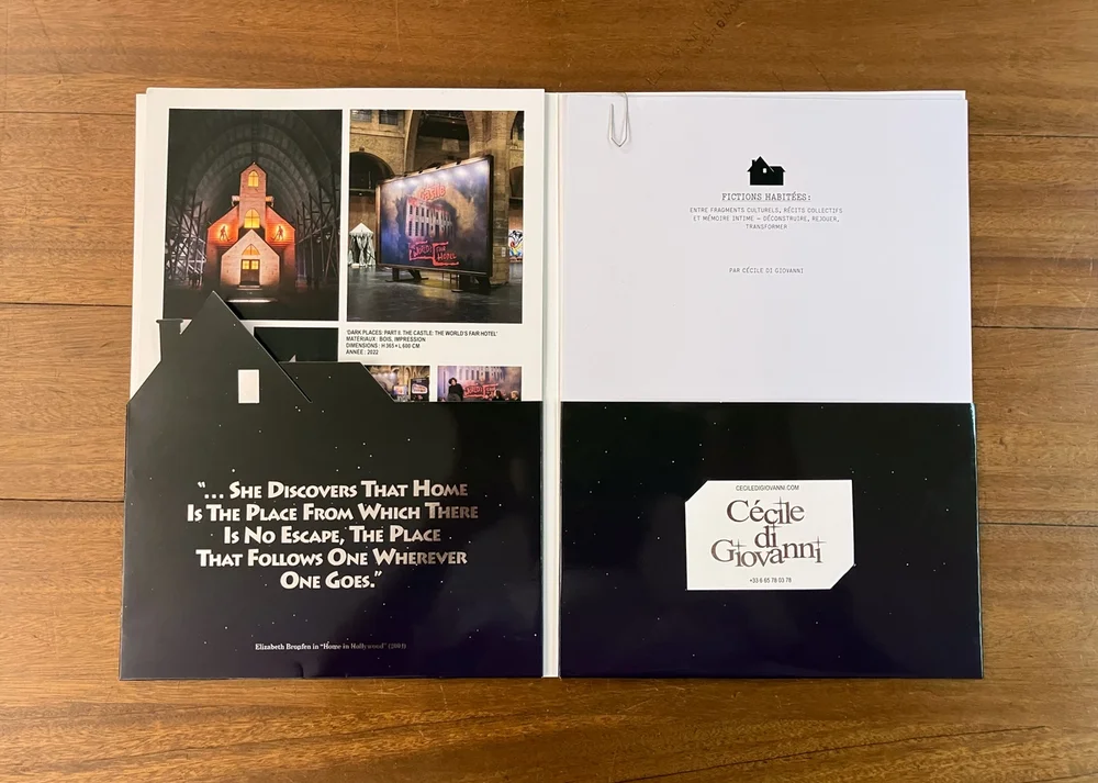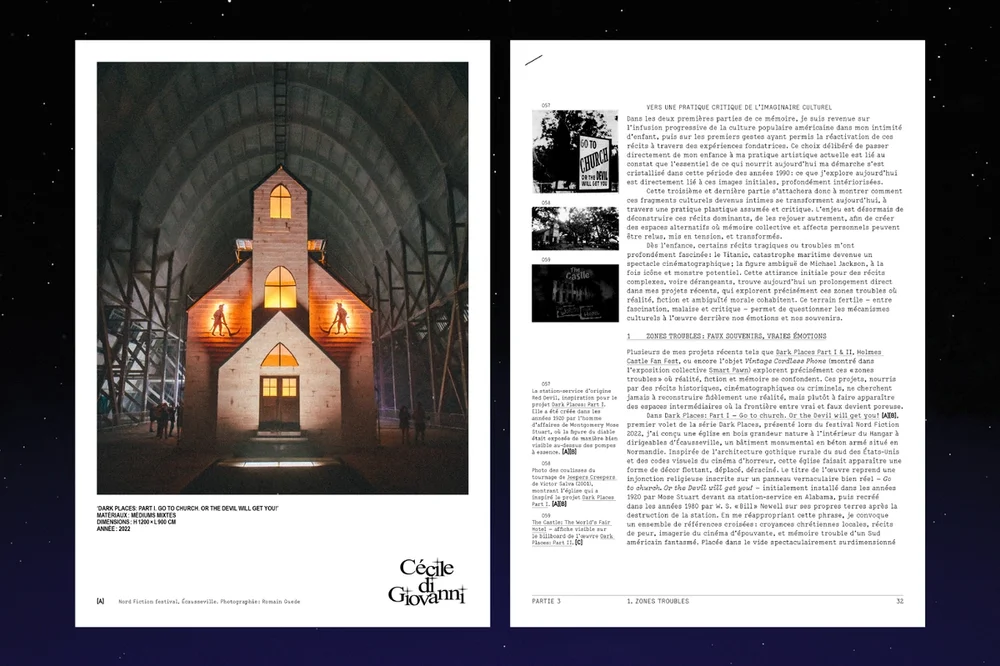 Inhabited Fictions. is Cécile di Giovanni’s DNSEP thesis (Master’s level/MFA-equivalent), written at ENSBA Lyon (the Fine Arts School of Lyon, FR). It examines how fragments of North American popular culture—places, objects, narratives—emotionally charged since childhood become artistic material, and how their reactivation allows us to replay, subvert, and transform shared memory while building a critical gaze on dominant narratives. Designed by Text and Graphics (TaG).
