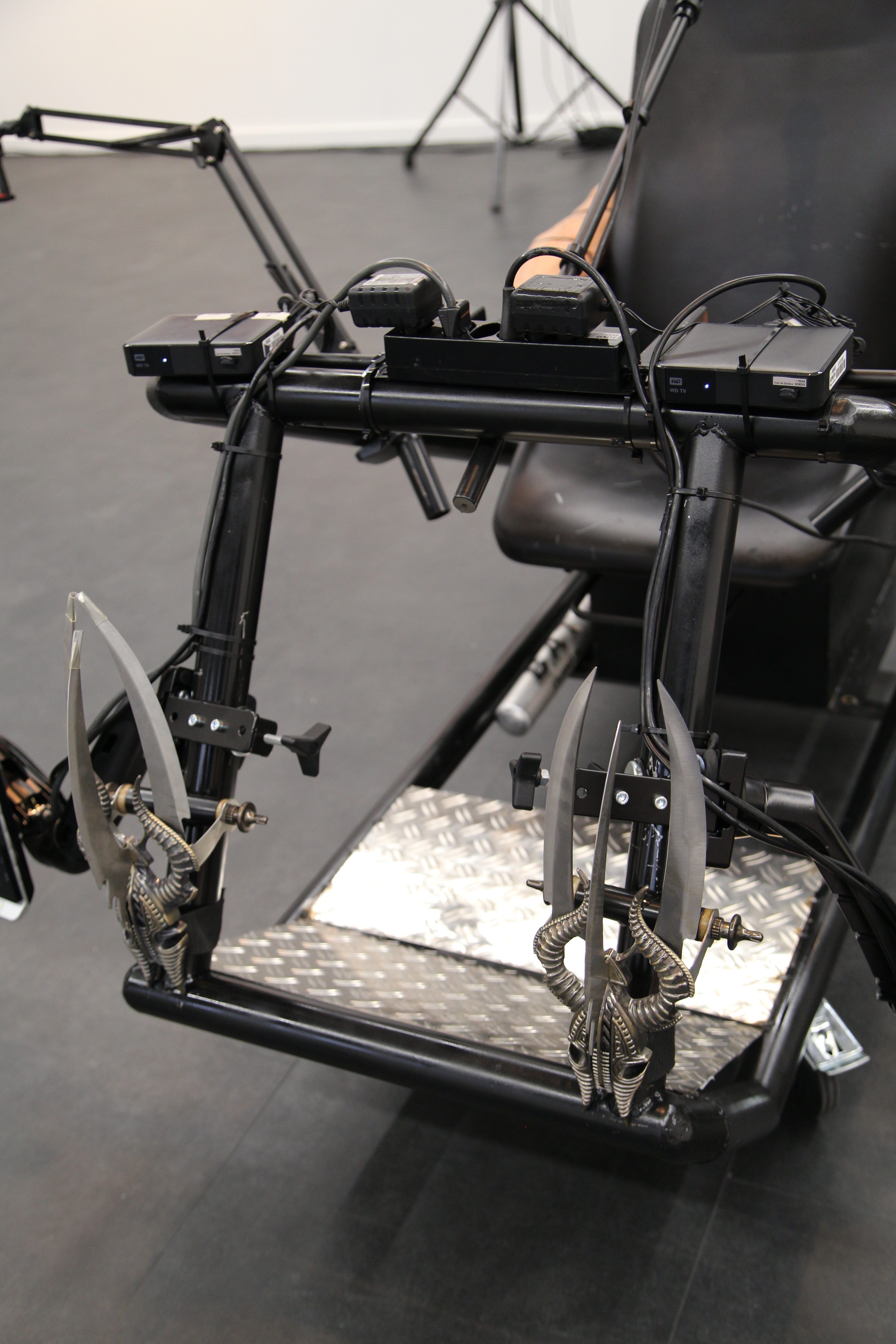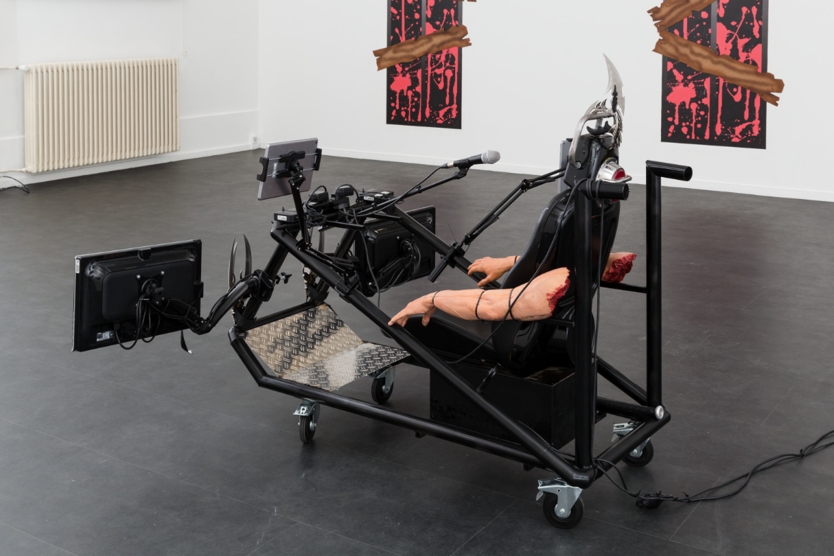 The cart that carries Mathilde Fernandez was conceived by Cécile di Giovanni. Echoing the metaphor of a boat crossing between shores and gradually encountering fragments of memory, here, in the form of problematic videos from online influencers, di Giovanni envisioned a kind of 2.0 vessel, drawing inspiration from a low-tech, hacker-inspired imaginary.
