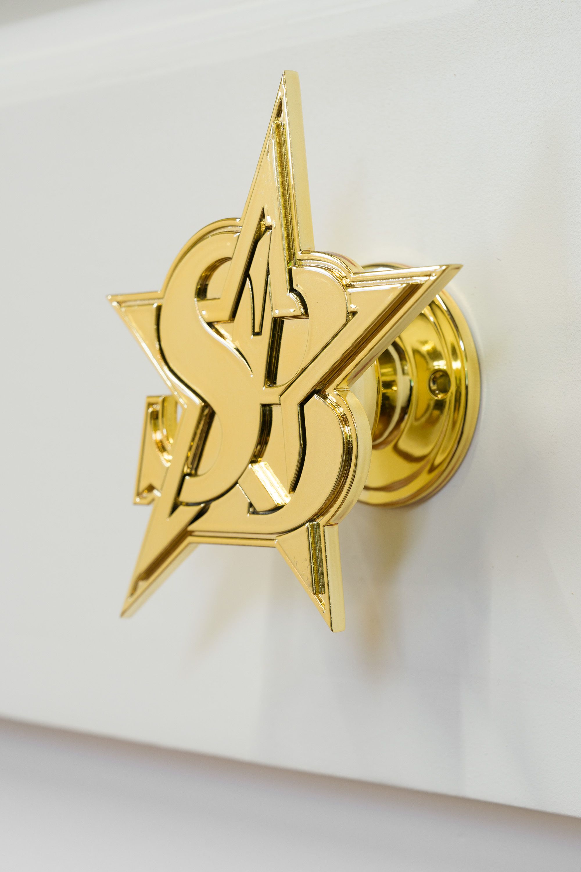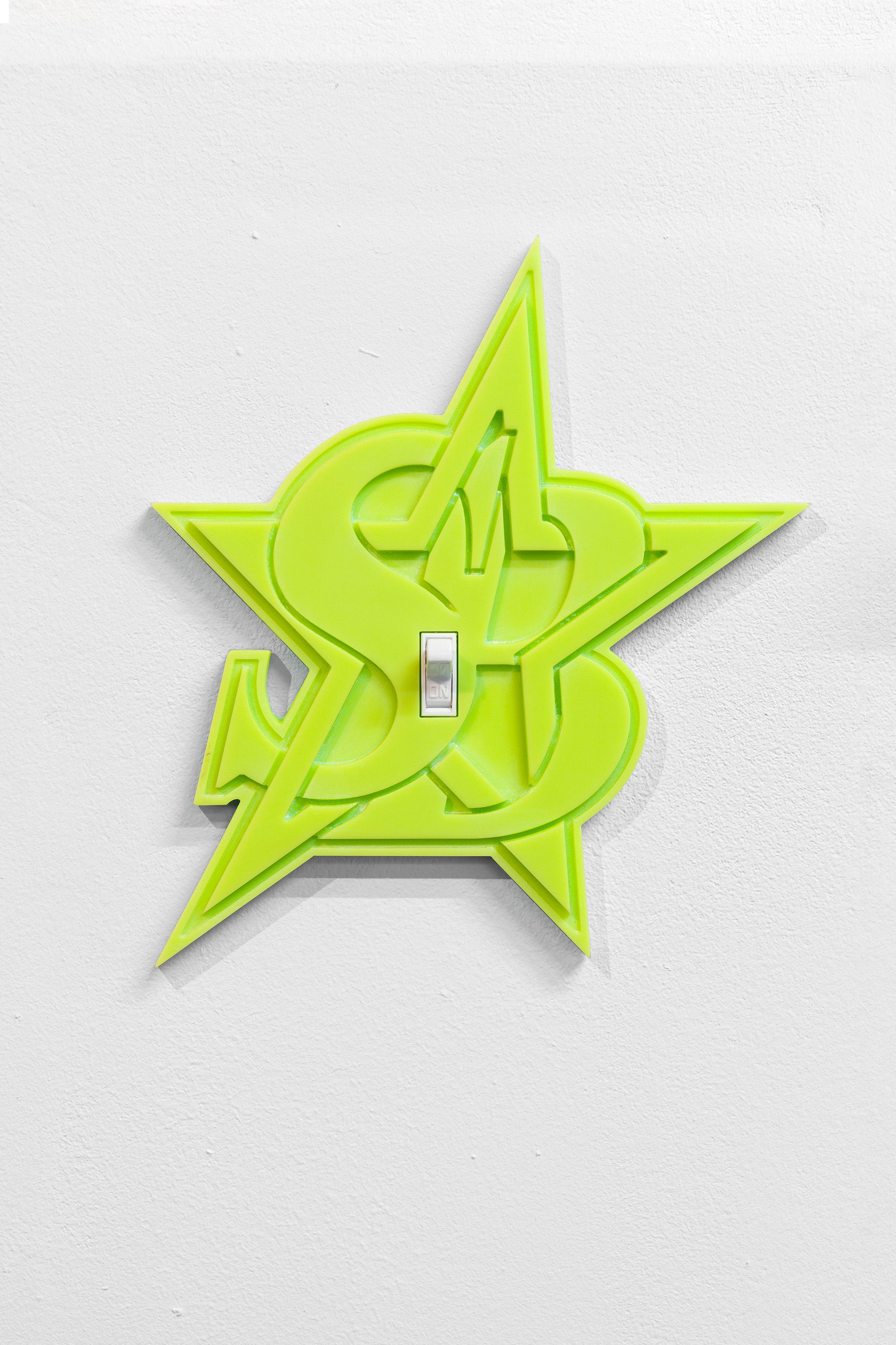 The exhibition takes the form of a fragmented interior built from sculptural “house totems”: a split bedroom door with a poster and custom handle, a wall-mounted logo plaque, and an oversized light-switch sculpture. Chrome finishes, glossy printed surfaces, and composite plastics echo the aesthetics of 1990s hotel décor, theme-park fantasy, and televised pop culture.