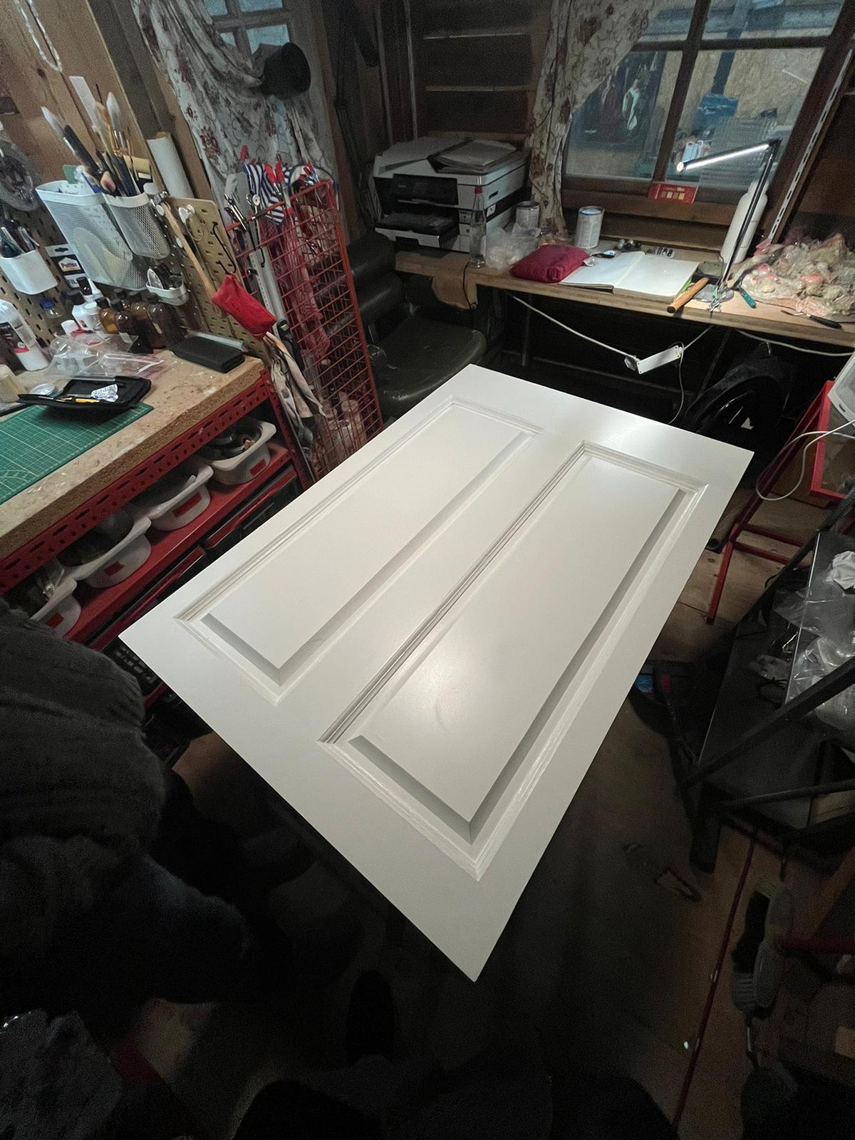 In the installation, the door is split in half and reconfigured into a sculptural fragment. By doing so, it no longer functions as a passage, but as a frame: the door becomes both the surface that once held the poster, and the structure that now frames it. This reversal blurs the line between container and content, decoration and device, echoing the way personal spaces absorb and re-stage fragments of collective memory and popular culture.