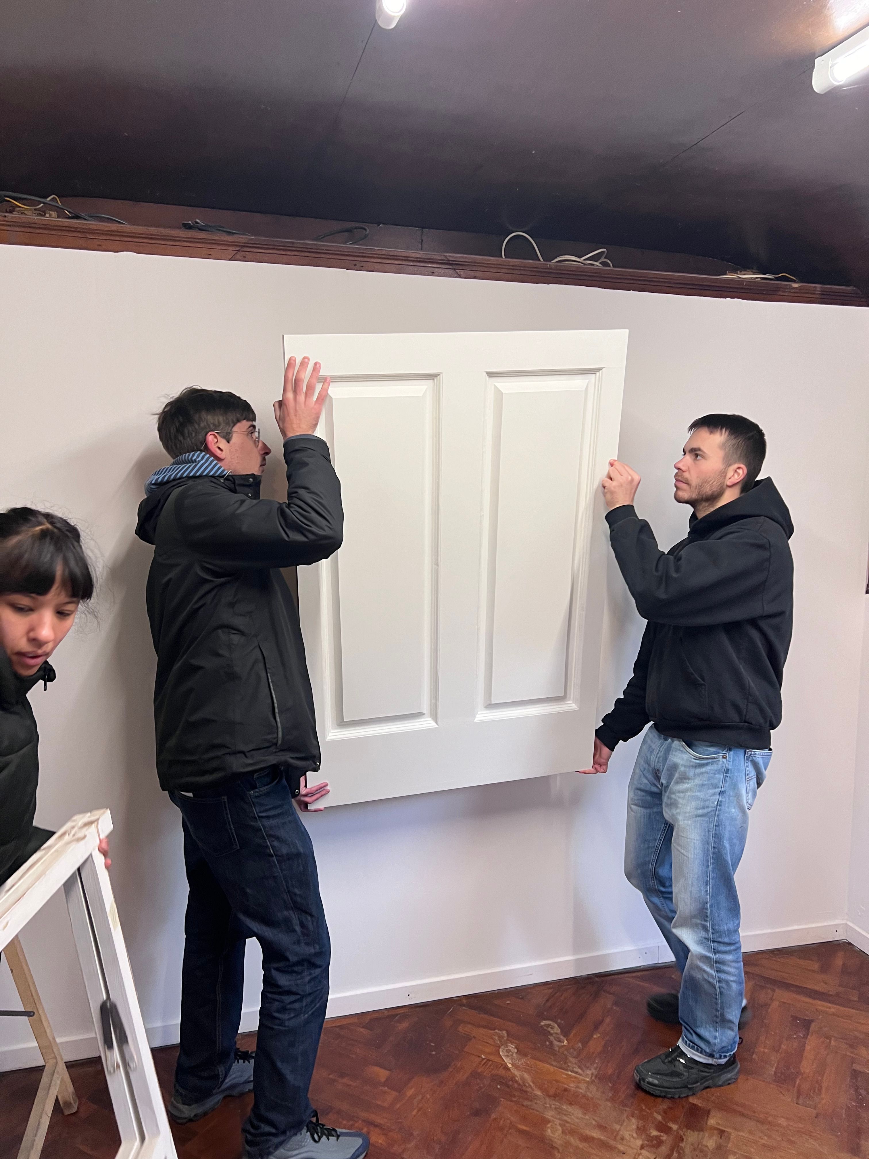 The proportions of the door fragment required careful development. The main challenge was to find the right balance between the scale of a typical North American door cut in half, large enough to support both the poster and the handle while retaining its presence as an object, and the need for the fragment to remain coherent in scale within the exhibition space.