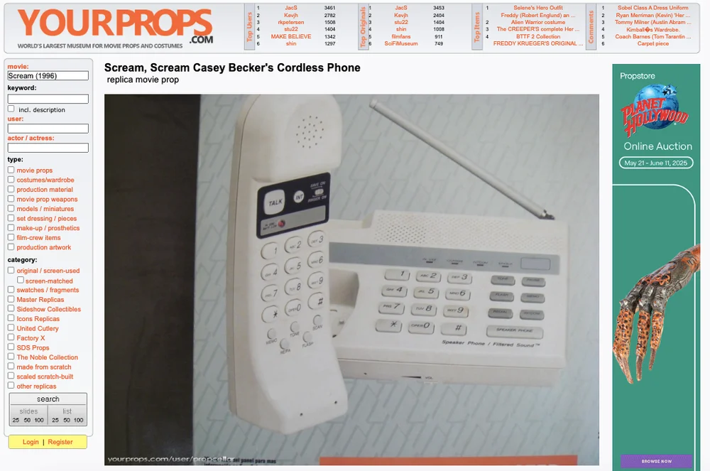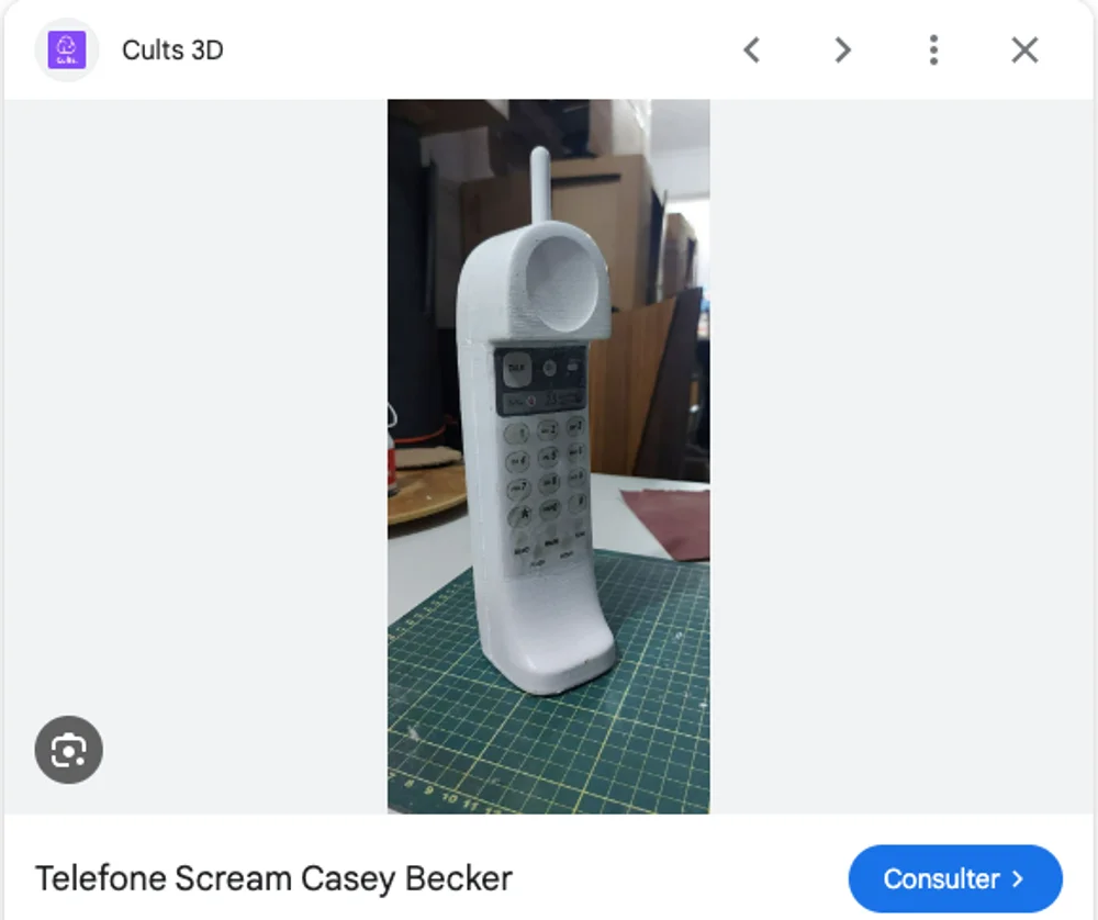 Various posts on Reddit forums from users searching for the BellSouth phone model used in the first Scream film. Also shown: an image of a cardboard replica of the phone available for purchase on Etsy, as well as a 3D-printed version for sale on the Cult 3D website.