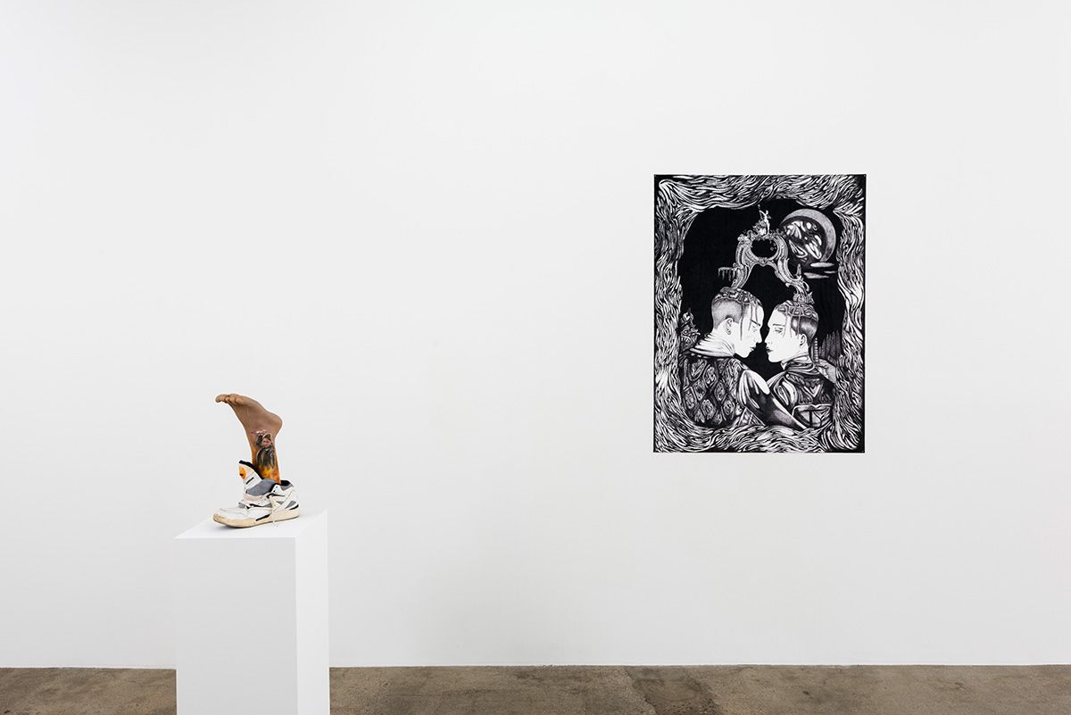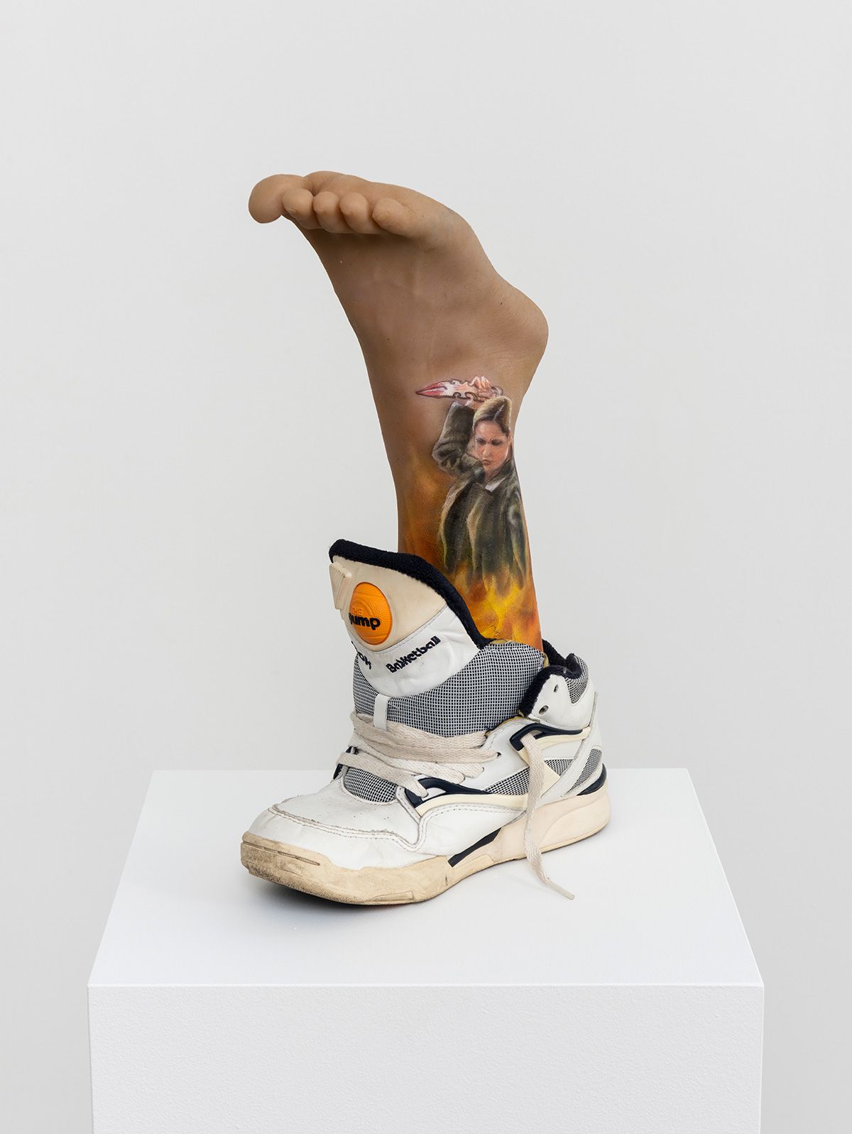 Cécile di Giovanni exhibited the work The Slayer, which plays with fetishization, cultural memory, and fictional corporeality through an assemblage that is both absurd and symbolically charged. A reversed silicone foot placed inside an iconic 1990s sneaker becomes the paradoxical base of an inverted monument. The tattoo of Buffy the Vampire Slayer, a cult television heroine, inscribed on the synthetic skin, marks the body with a figure of strength, resistance, and ambiguity.