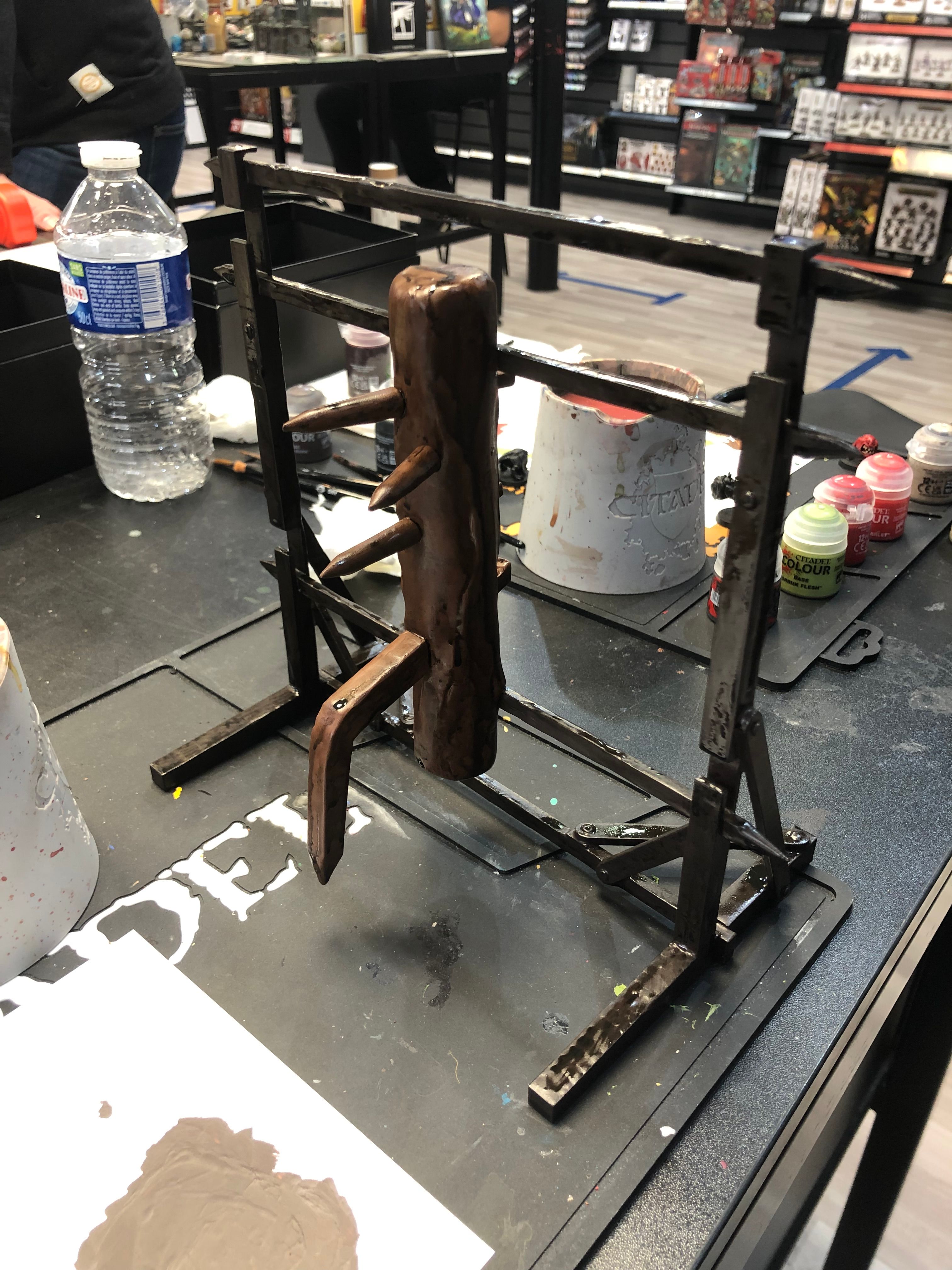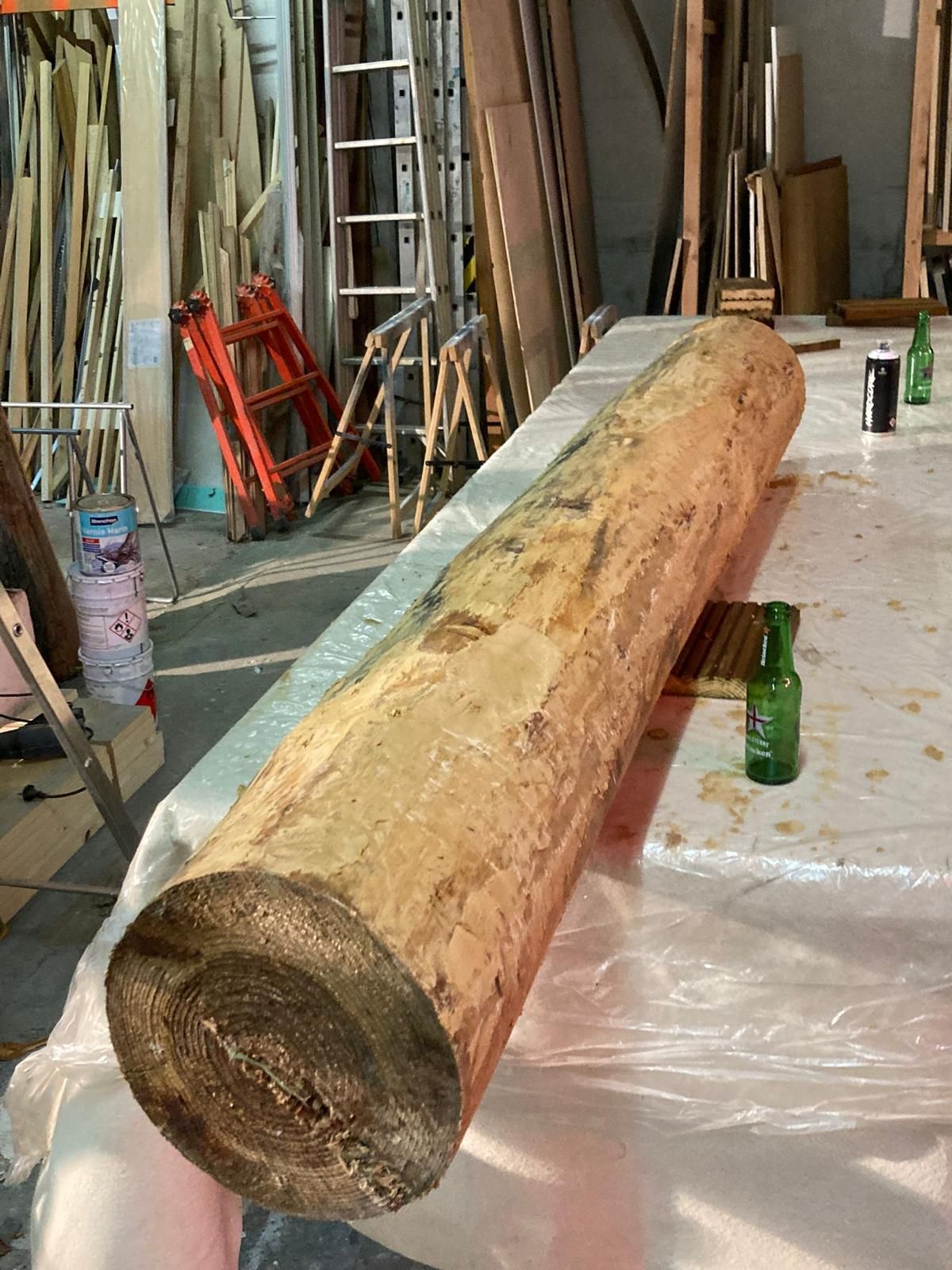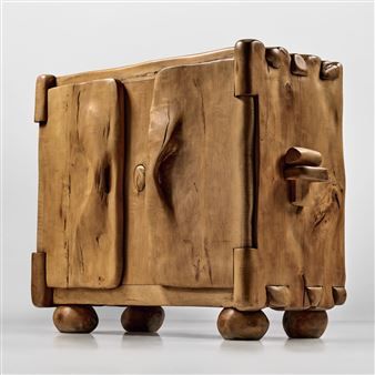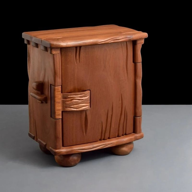The totem figurine was first modeled and 3D printed, then painted, sanded, and varnished to achieve a deliberately plastic-like finish. The life-sized wooden totem was initially painted with a wash and then coated with varnish in an effort to echo the look of the 3D-printed miniature. Both the wood and the plastic were worked to reveal scratches and marks, drawing inspiration from a wide range of references, from the refined craftsmanship of Alexandre Noll to raw, hand-carved wooden objects etched with a blade.