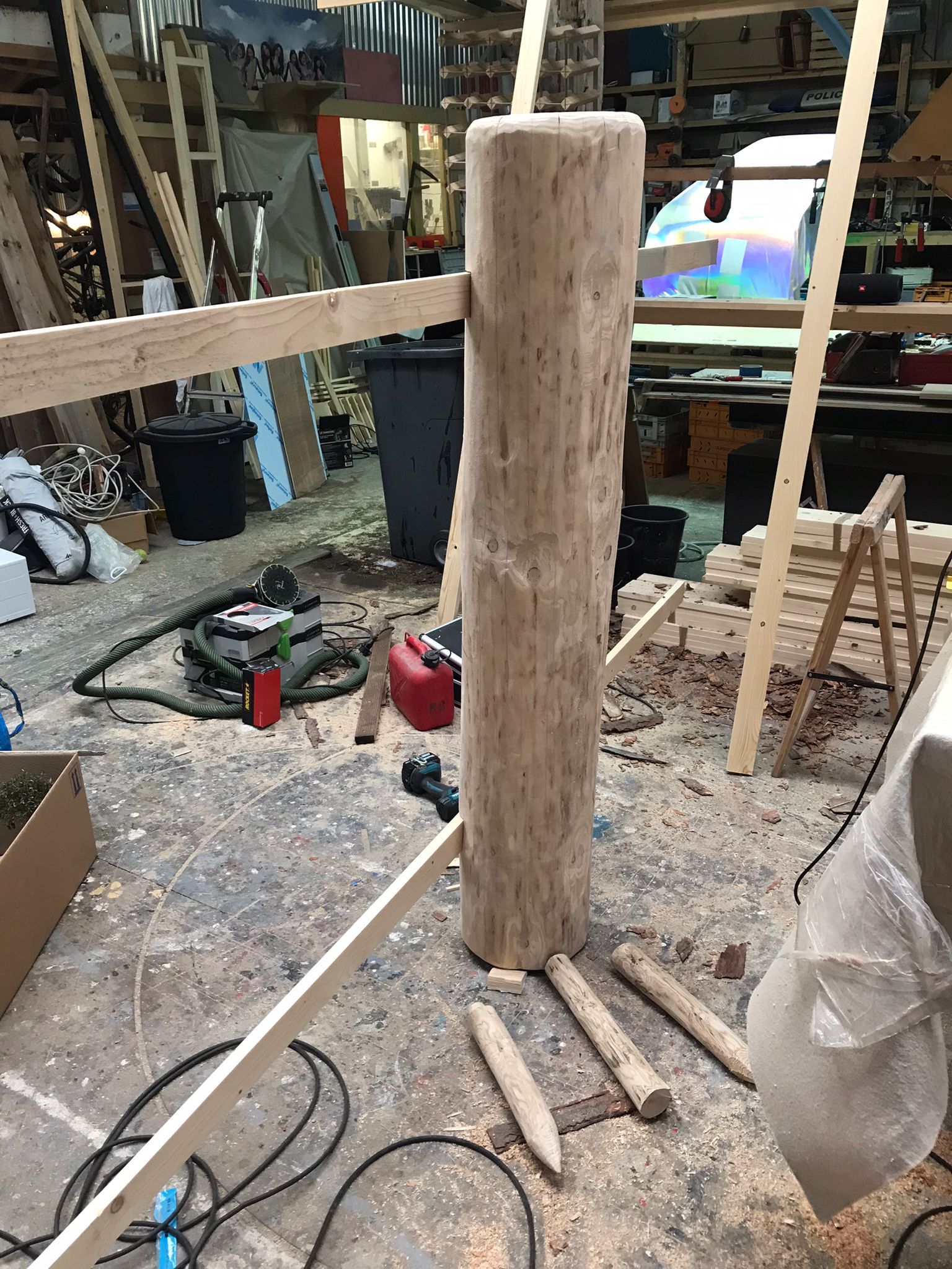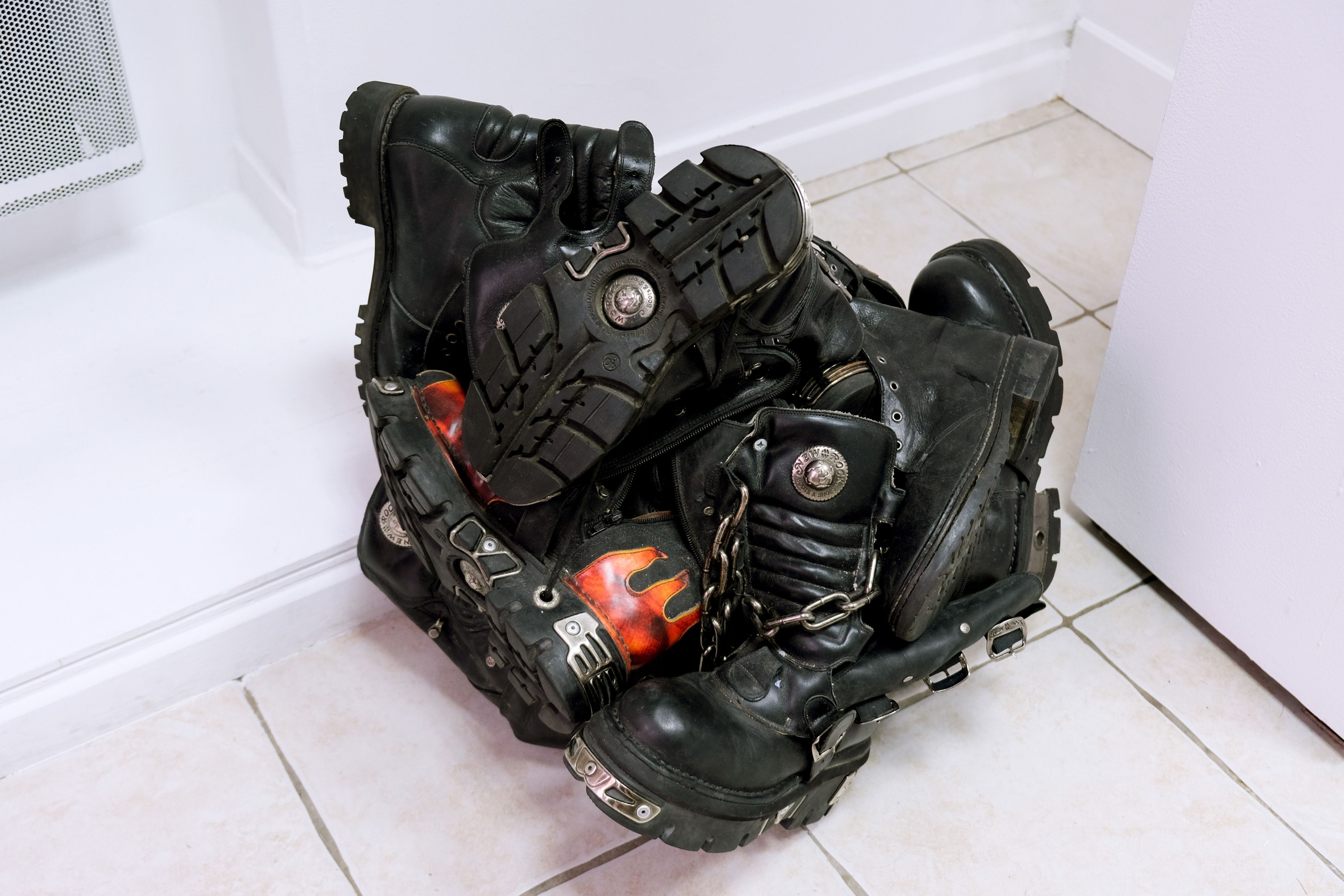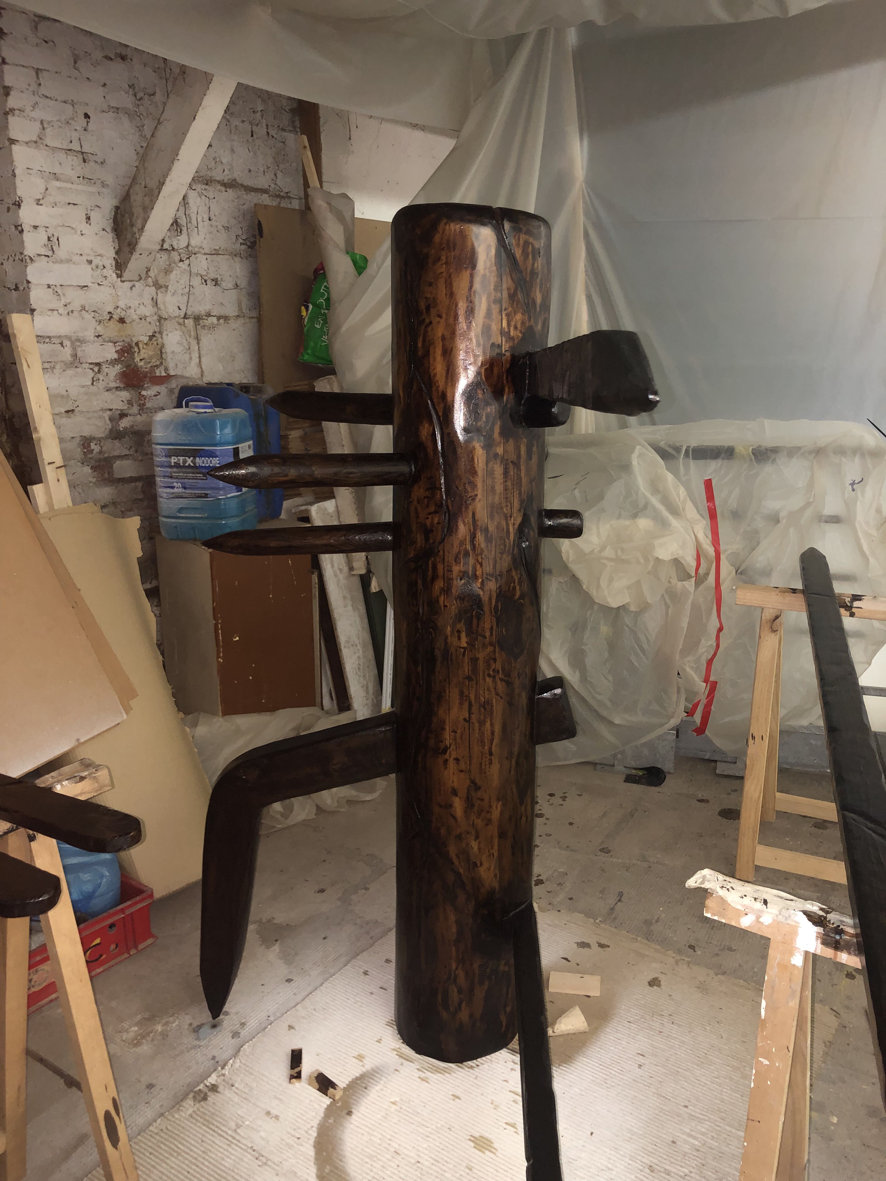The sculptural work ‘YWNWA Totem’ (2021), based on a mu ren zhuang (Chinese: ⽊⼈樁) which translated means “wooden man post”, stands as an ambient threat in the centre of the space. The works around it arm, protect, and modify our bodies. Inspired by real and fictional situations, Giovanni tries, not without irony, to reveal through the symbolic strength that these objects and materials induce, the power, the complexity, and the sides of the human mind when it is backed into its more extreme corners.
