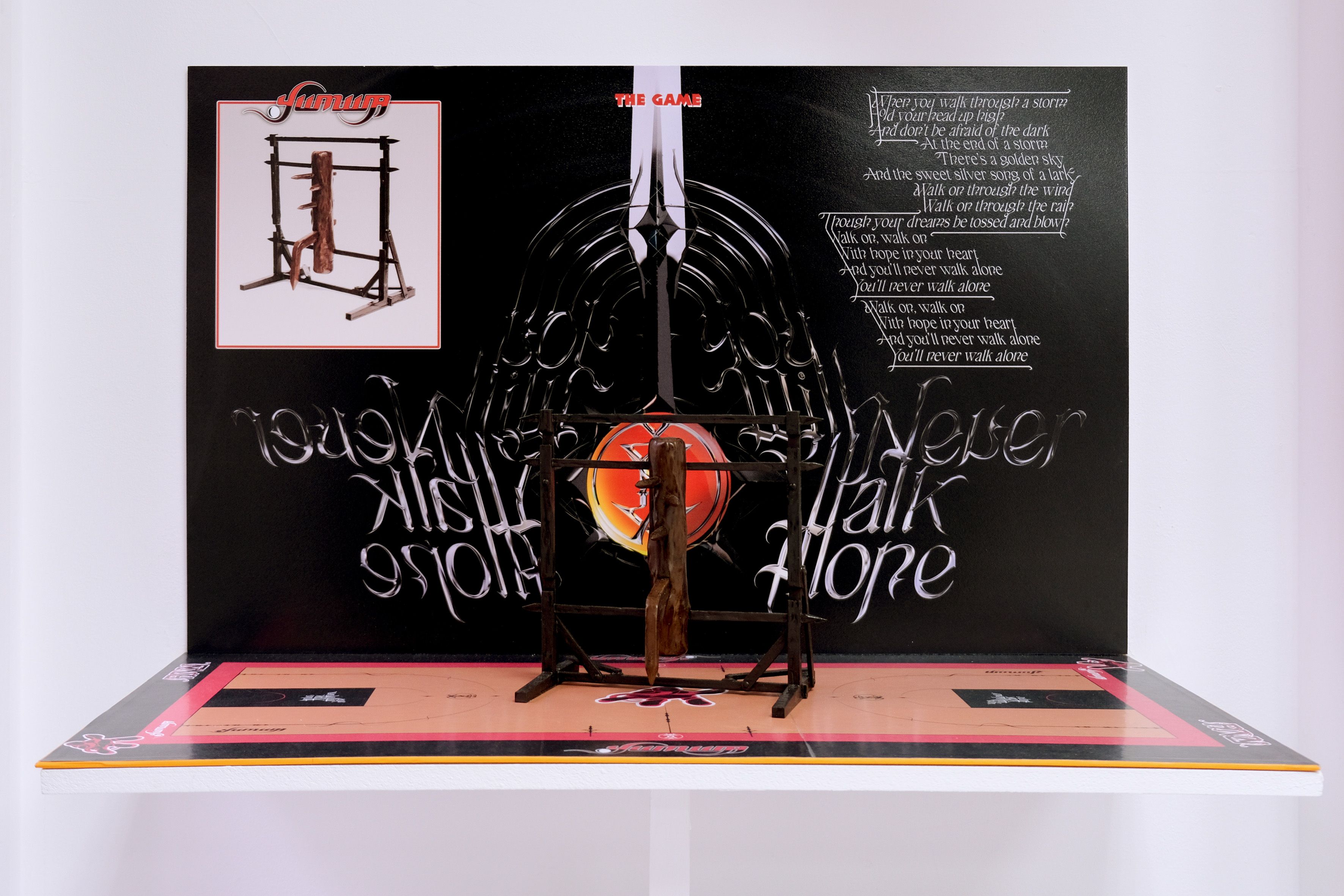 With installations that variously evoke martials arts, pop culture, fetish and football, the show turns the space into an oversized board game for the gallery visitor to negociate. As noted in the press release: "Childhood, its ruptures, nostalgia, and innocence give way to the inevitable violence of things coming to an end."