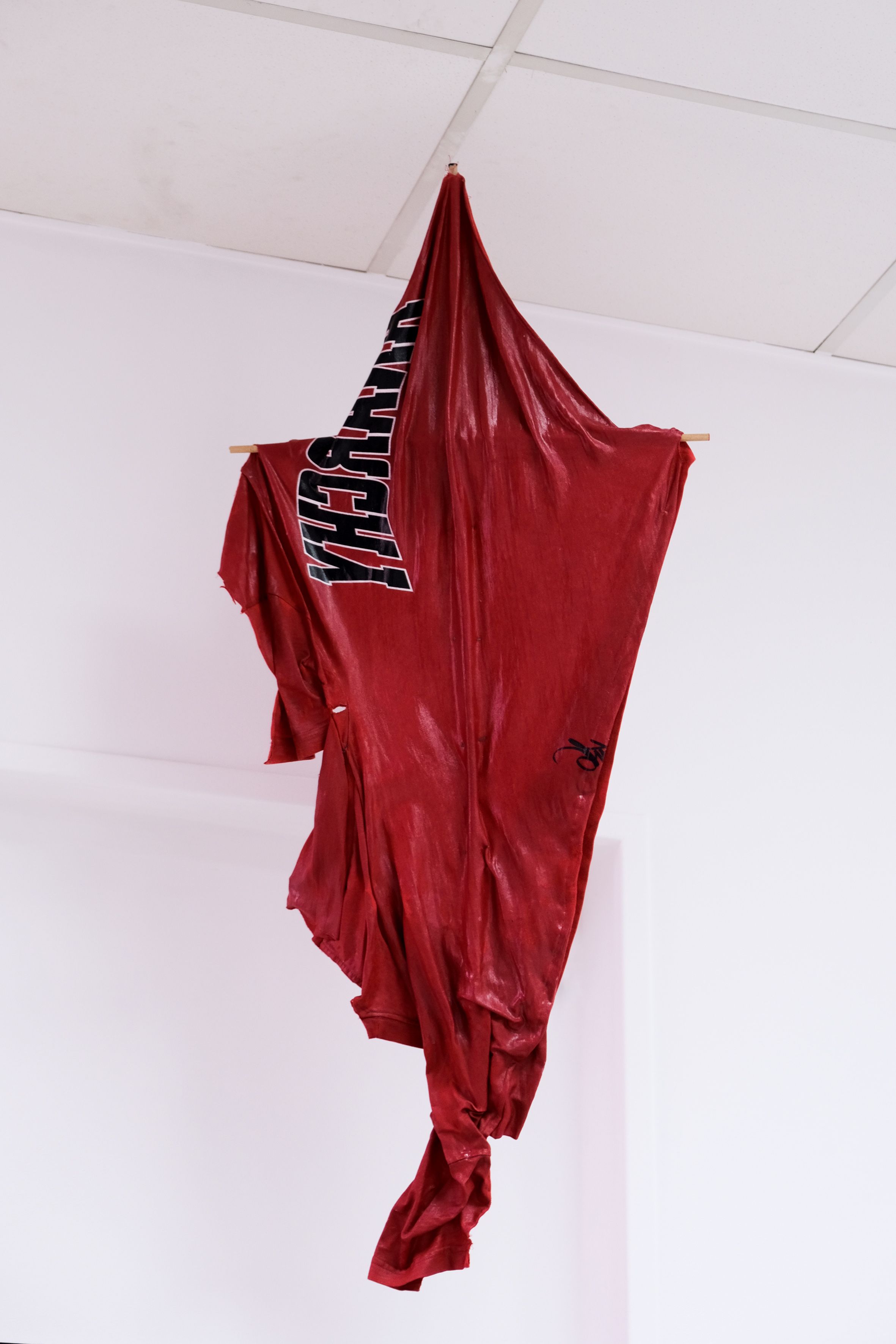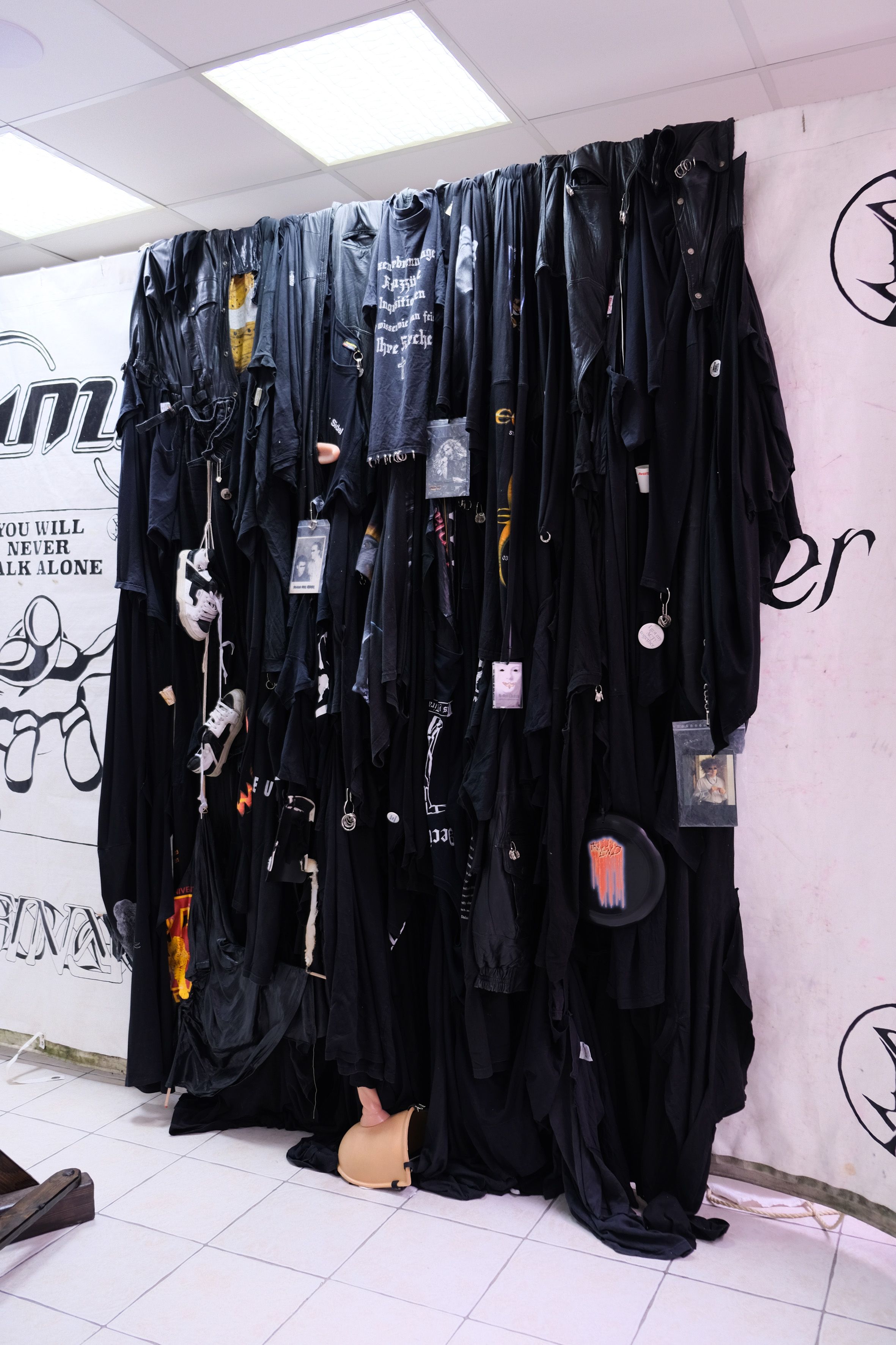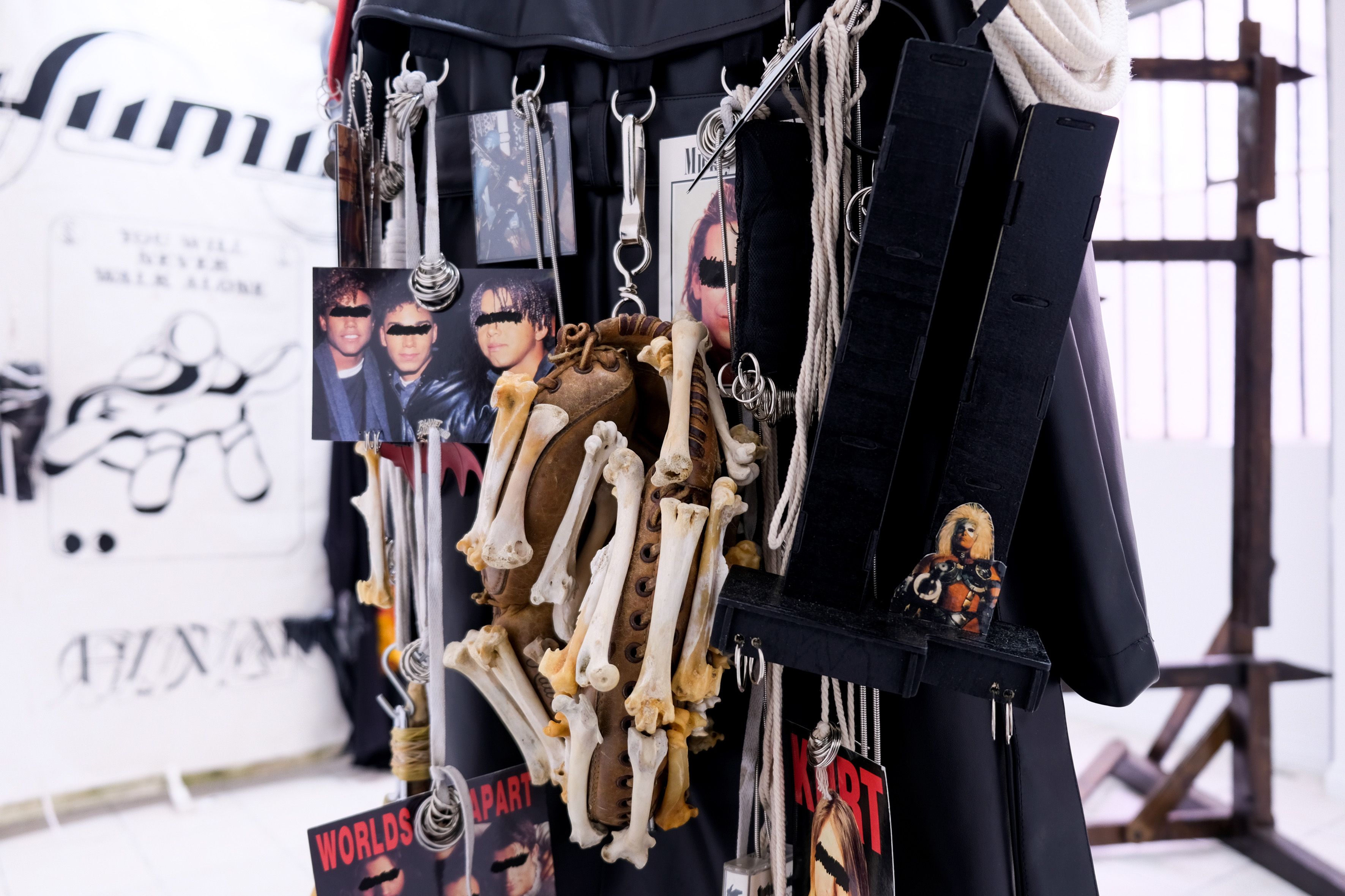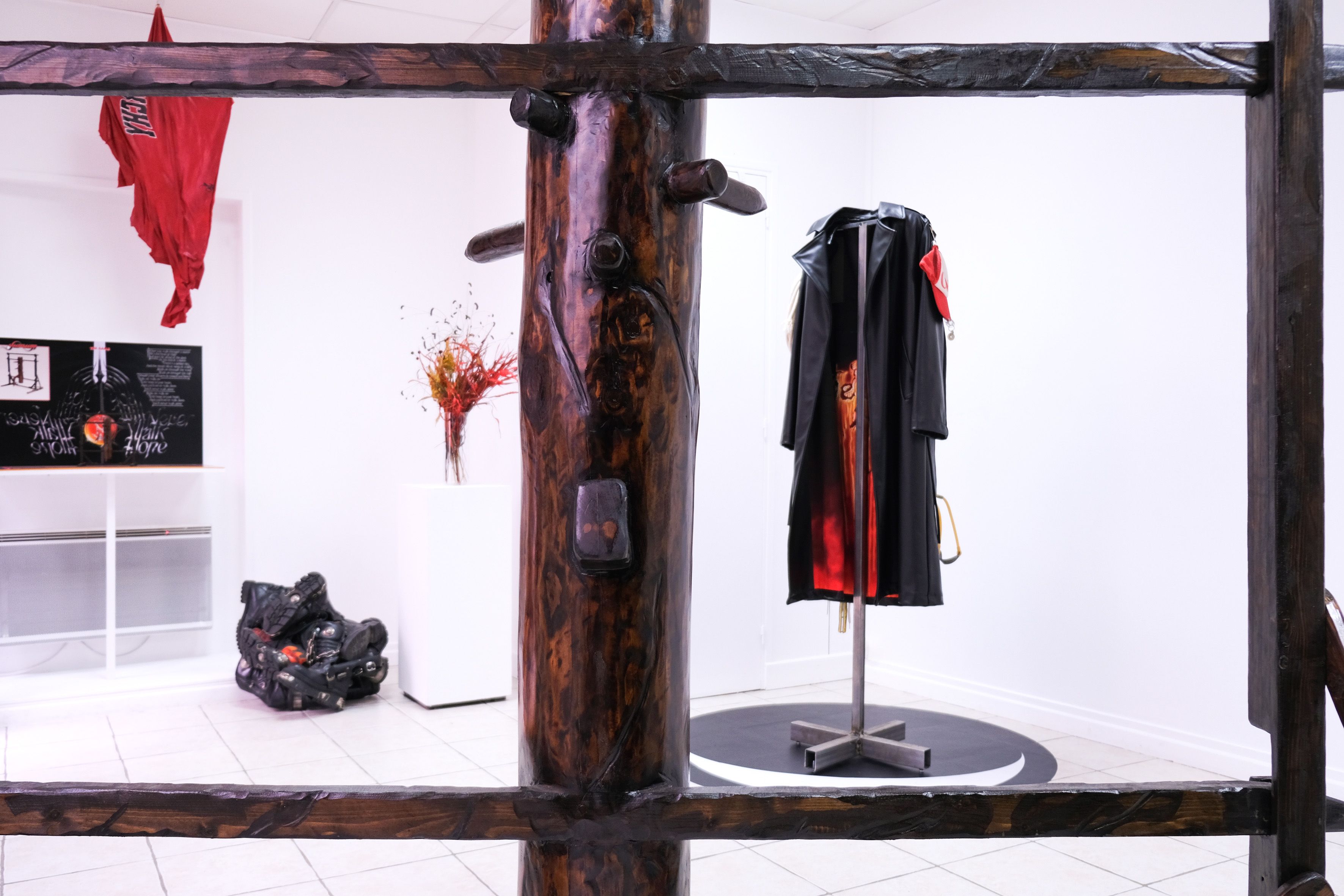 The exhibition was designed as a symbolic interior, a hybrid landscape borrowing from martial arts aesthetics, pop culture, role-playing games, and childhood imagination. Visitors navigated through oversized props, protective objects, and sculptural forms that evoked armor, talismans, or transitional objects.